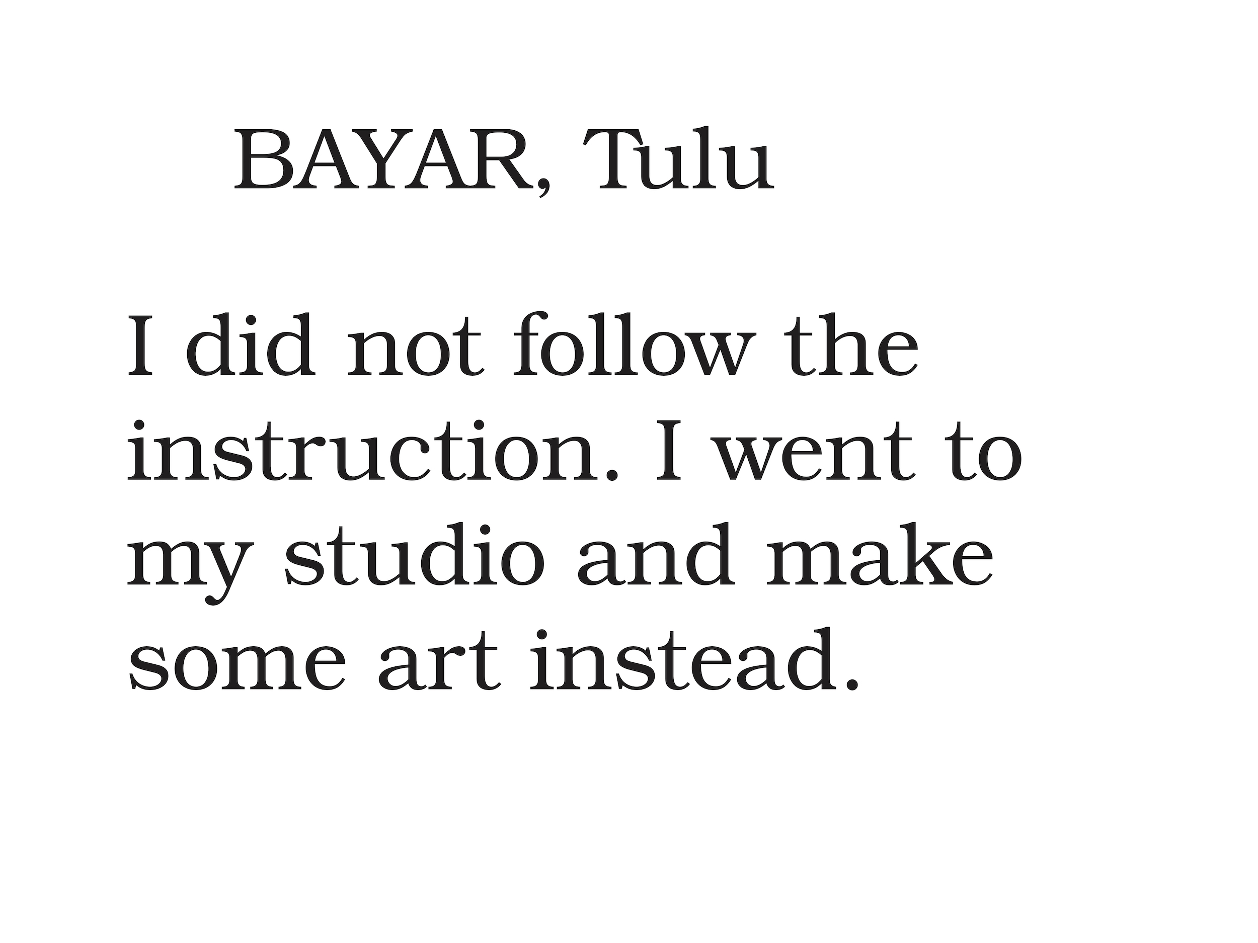 These are the artists’ instructions; every week two of them will be enacted by local community members and appear on the wall of our gallery alongside the instructions – creating an unfolding exhibition-in-progress. Everyone is encouraged to participate online; simply render your own interpretation and post it on Instagram with the hashtag #doithome”